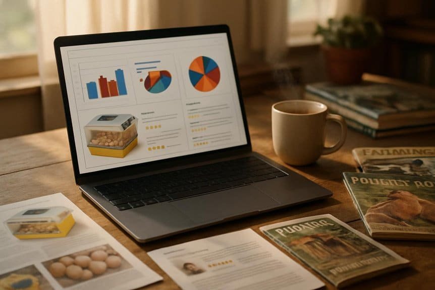 Wanneer je op zoek bent naar betrouwbare broedmachine beoordelingen, komen de beste inzichten vaak van actieve online gemeenschappen en forums waar hobbyisten en professionals praktijkervaringen delen. Je vindt gedetailleerde hobbyistenverhalen op Trustpilot-achtige forums en pluimveefokker platforms, waar gebruikers merken als Brinsea, MS en Rcom bespreken. Nederlandse retailers zoals 123broedmachine.nl nodigen uit tot vragen stellen en begeleiden gebruikers, wat een gemeenschapsgerichte ondersteuningssysteem weerspiegelt. Terwijl je beoordelingen leest, zul je discussies opmerken over uitkomstpercentages, betrouwbaarheid en beschikbaarheid van onderdelen. Velen wijzen erop dat goedkopere broedmachines moeite hebben met vochtigheid en temperatuurregeling. Vergeet de forumetiquette niet: wees respectvol, zoek voordat je post en draag je eigen ervaringen bij. Door doordacht deel te nemen en je reis te delen, help je anderen om weloverwogen beslissingen te nemen en bevorder je een behulpzame, ondersteunende gemeenschap. Voor de beste resultaten is het belangrijk om de temperatuur en vochtigheid tweemaal daags te controleren om de ideale broedomgeving te behouden.