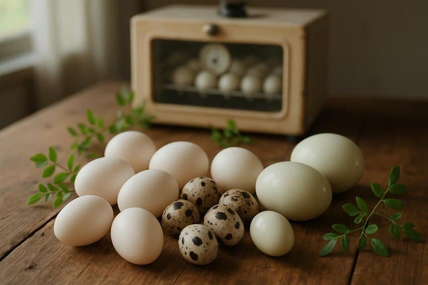 Als je net begint, kies dan schone, ongebroken eieren van gezonde, lokale hennen—bij voorkeur rassen zoals Silkies of Cochins die bekend staan om hun betrouwbare broedgedrag. Zorg ervoor dat de schalen sterk zijn en dat de eieren vergelijkbaar van grootte zijn, aangezien dit helpt bij een consistente ontwikkeling. Controleer altijd of je eieren vers zijn (minder dan tien dagen oud) en afkomstig zijn van gerenommeerde fokkers. Begin met een beheersbaar aantal, zoals zes tot twaalf eieren. Hierna ontdek je hoe je de vruchtbaarheid kunt controleren en je kunt voorbereiden op een succesvolle uitkomst.